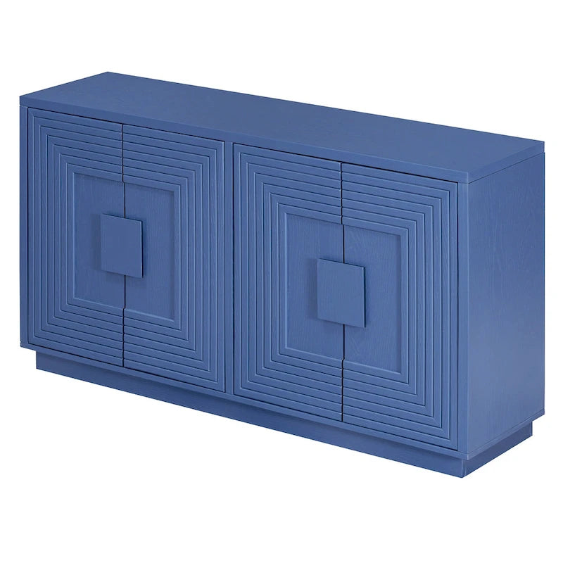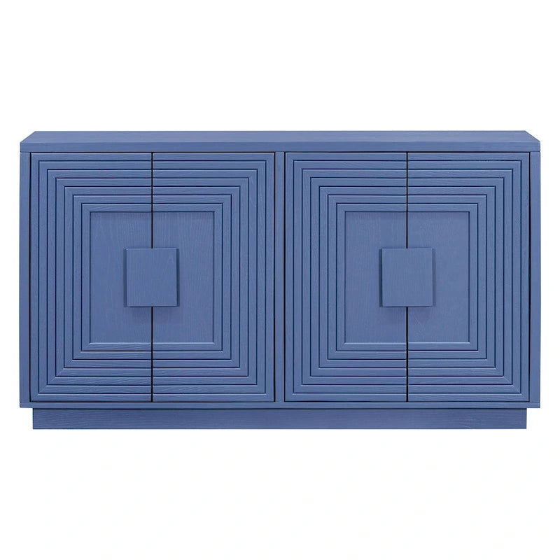 Retro Fluted Design: This fluted cabinet features a symmetrical four-door layout, combining sleek lines with a unique fluted texture. The distressed finish exudes vintage charm, blending classic and modern elements to fit various home decor styles. It serves as a stylish buffet cabinet with storage for the dining room, kitchen, or living room. Available in three colors: antique white, navy blue, and espresso.