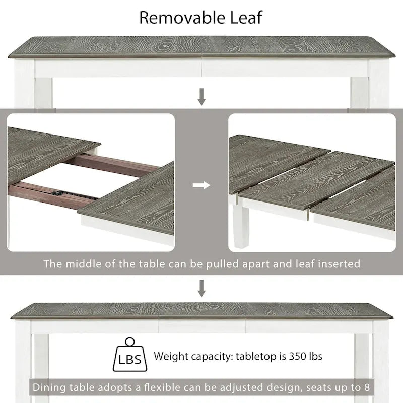 This antique wooden extended dining table set looks simpler and more delicate. This beautiful piece adopts distressed finish design and elegant curves, and looks clever and sophisticated. The tabletop is built on 4 stable solid wood legs, with a removable leaf, so you can adjust the size of it to accommodate your space. A sturdy rubber wood and pine structure guarantees the service life and style of your home.