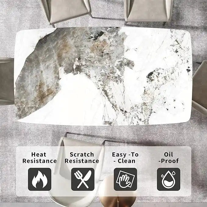 Create a cozy, inviting kitchen with this dining table. Crafted from sintered stone and stainless steel, the pedestal base forms stable support, which lends instantly an eye-catching appeal to your arrangement. The edges are polished by hand many times, so that the four rounded corners are smooth and flat, preventing children from bumping, smooth to the touch without barbs, fully considering the home life experience. Three table color for you to choose from. Inject modern charm into your dining room with this stylish luxurious piece! Please note there will be slight variations in pattern between each product due to the natural material.
