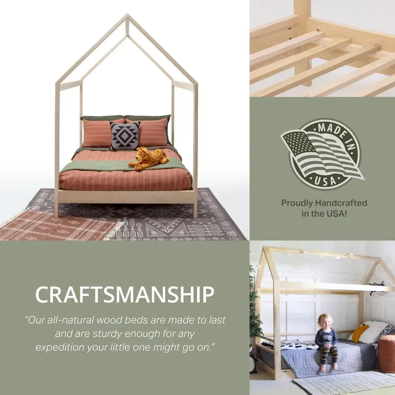 What a great functional piece for your kids room! Now they can have a home inside their home with this adorable house bed frame. Make the transition out of the toddler bed exciting for your little ones! This is a sturdy product made from unfinished solid knot free furniture grade poplar. You can stain or paint any color you wish or you can leave the item unfinished. Your bed purchase plants trees too! We plant one tree for every bed sold through One Tree Planted foundation! Available in twin, full and queen size.