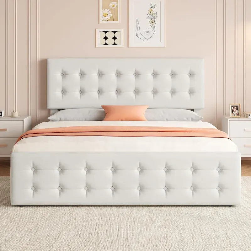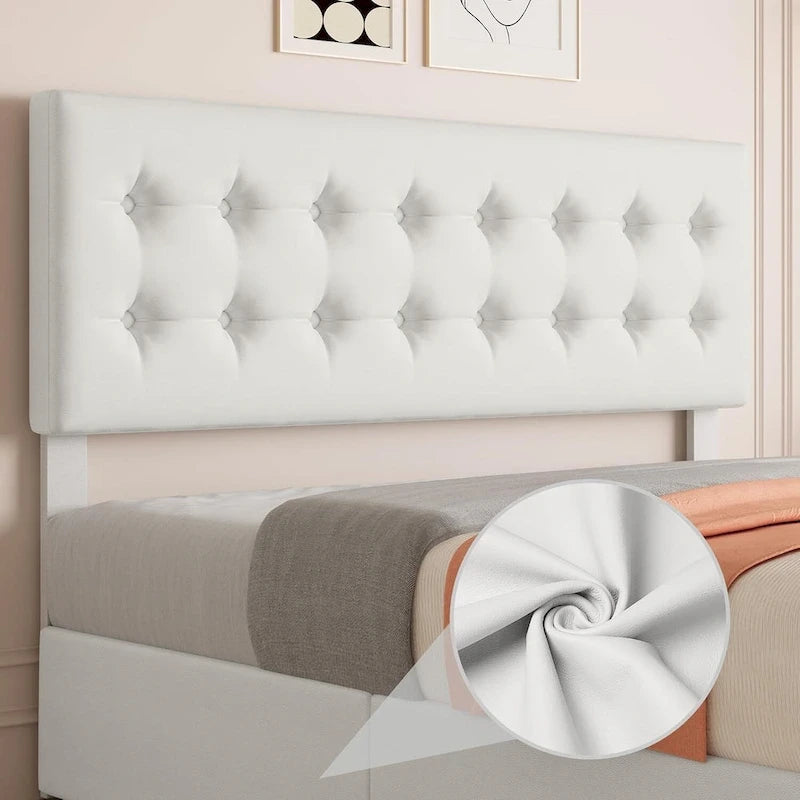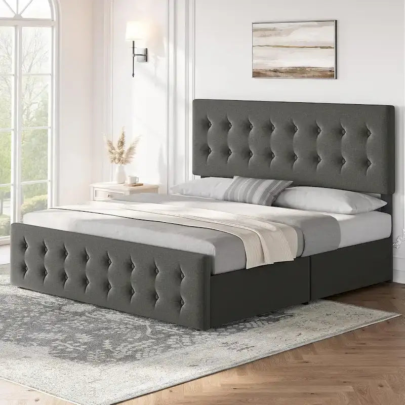 4 Storage Drawers: This queen bed frame includes four roomy storage drawers underneath, offering plenty of space for bed sheets, accessories, off-season clothing, and more. These drawers provide a convenient and organized solution to help keep your bedroom tidy and free of clutter.Adjustable Headboard: This bed frame features a customizable headboard that can be set to heights of 39.4 inches or 45.7 inches, making it compatible with mattresses ranging from 8.3 to 14.6 inches in thickness. Elevate the elegance of your bedroom with our deluxe bed frame, upholstered in luxurious linen fabric and designed with a button-tufted finish, adding a sophisticated touch to your space.Sturdy Construction: Our bed frame is expertly crafted from high-quality metal and board, designed to offer exceptional durability and longevity. To enhance stability, the bed frame features reinforced legs that effectively prevent twisting and wobbling, allowing it to support up to 1000 pounds. Whether you're lounging, sleeping, or entertaining, you can trust this bed frame to provide a reliable and sturdy base for your bedding needs.NO Noise & No Box Spring Needed: We've added a noise-dampening sponge strip along the middle beam to reduce friction between metal parts, effectively eliminating any creaking noises. This bed frame ensures a quiet and restful night's sleep without the need for a box spring.Easy Assembly: It takes just 1 hour with included hardware, tools, and straightforward instructions.