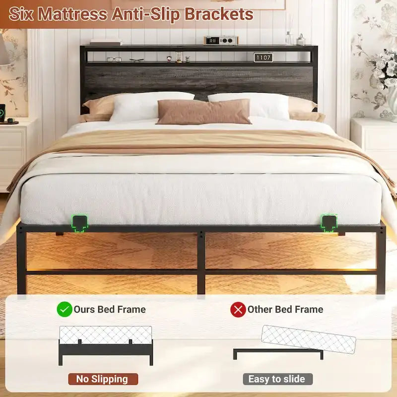 Bed Frame with headboard, Metal Platform Bed with LED Lights and Charging Station