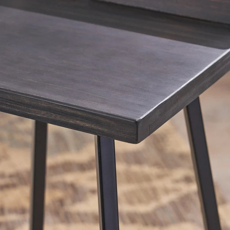 - Tapered black legs and footrails complement an angular, square acacia wood seat polished to a gorgeous sheen.