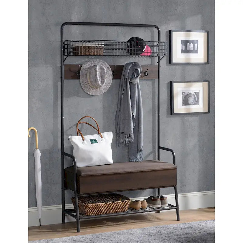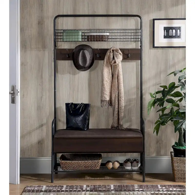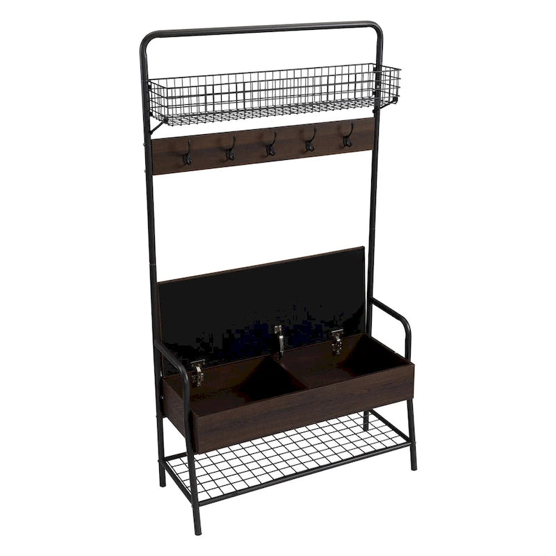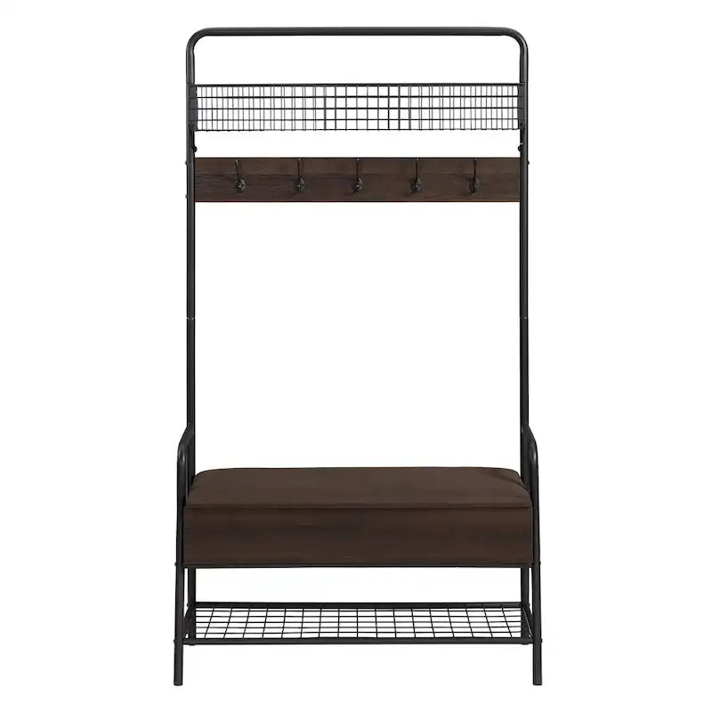 Add a stylish and functional touch to your entryway with our Coolidge Industrial Hall Tree. Crafted with a sturdy metal frame and melamine surface, this hall tree provides long-lasting durability and stability. It features ample storage space under the seat and open shelves for shoes and accessories. With five double hooks, you can easily store hats, jackets, scarves, and more. The melamine surface resists moisture and stains, preventing scratches, making it a practical choice for high-traffic areas.