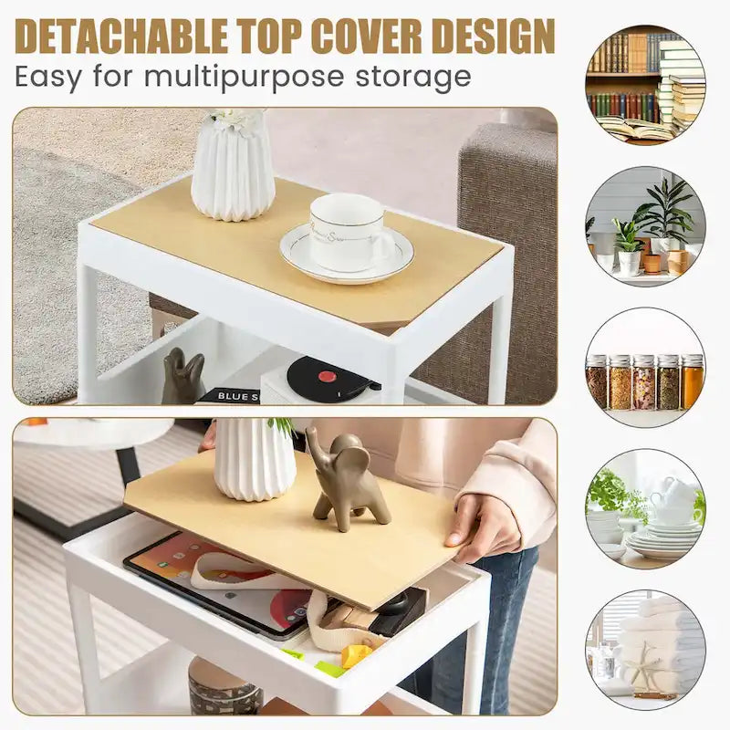 1 hidden storage compartment and 3 wide shelves for ample storage
