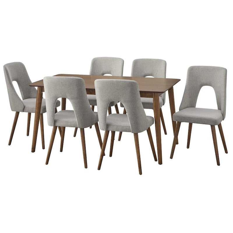 The Lifestorey Clover Dining Set brings a modern aesthetic to your dining space. Inspired by Mid-Century trends, the table is defined by clean lines, gently angled legs and warm walnut finish. Chairs feature striking open keyhole backs and angled wood legs. For added comfort and visual interest, the chair backs are gently curved and sloped at the sides in a modern interpretation of wingback chair styles. The upholstery is a soft gray fabric with a heathered texture that mimics the softness of linen. Table and chair legs are made of solid rubberwood. Tabletop is beautifully veneered MDF. Set includes table and 4 or 6 chairs.Includes one table and four or six chairs Transitional Mid-Century Modern design Rectangular table with tapered legs Comfortably padded chairs with unique open back Table seats up to 6 comfortably Easy assembly Table top crafted of MDF and veneer, sollid Rubberwood legs Walnut finish Chair crafted of solid Rubberwood, Linen-like fabric and foam Walnut finish with Grey upholstery Ships in three or four cartons Table dimensions: 29.75 inches height x 62 inches length x 36 inches width Table top thickness: 18MM Table top weight capacity: 220 lbs Chair overall dimensions: 36 inches height x 21.25 inches width x 23.25 inches depth Seat dimensions: 18.5 inches height x 19.75 inches width x 18.25 inches depth Chair weight capacity: 220 lbs Ships in multiple boxes Approximate assembly: 2 person/ 1.5-2 hrs