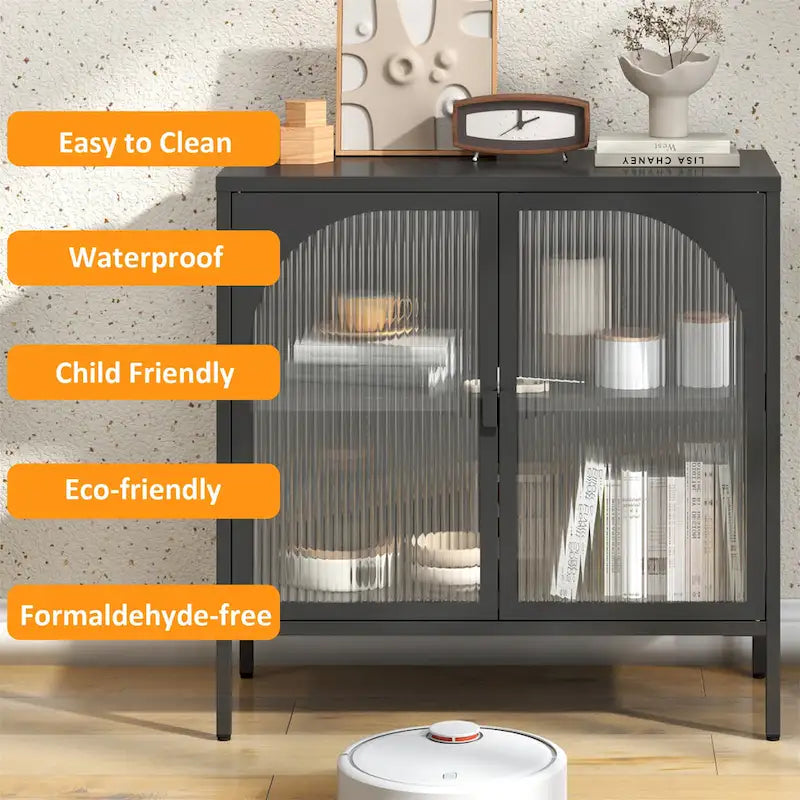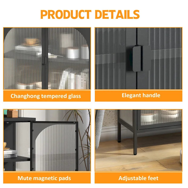 High-Quality Construction--Made from high-quality metal, this storage cabinet is sturdy and long-lasting. It is formaldehyde-free, ensuring it is safe and environmentally friendly.The metal frame combined with tempered glass doors resists rust, corrosion, and wear, extending the cabinet's lifespan for long-term use.