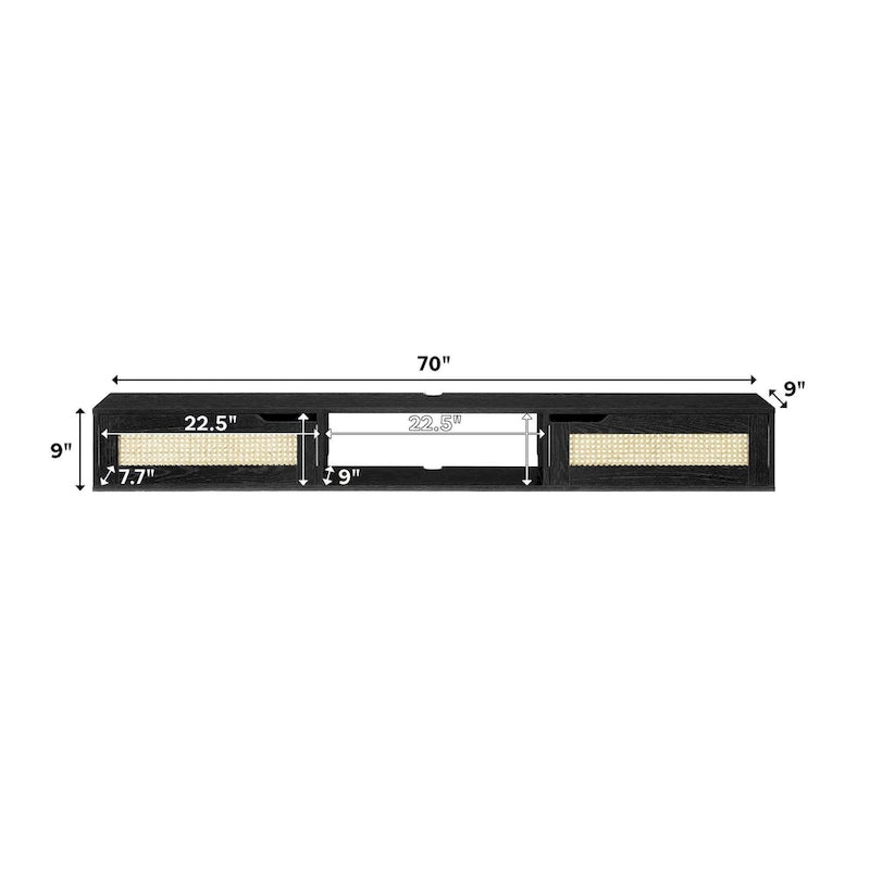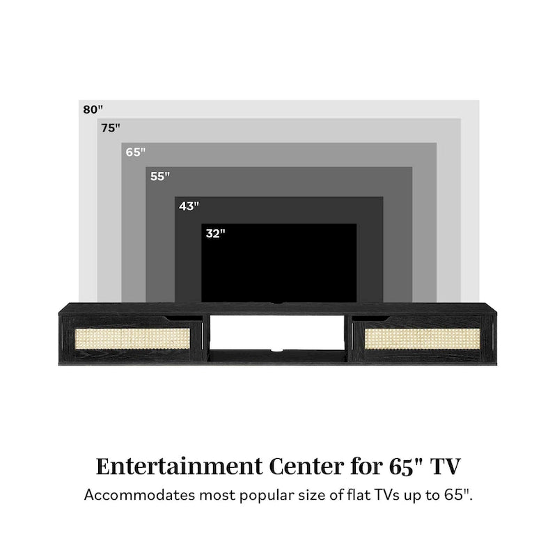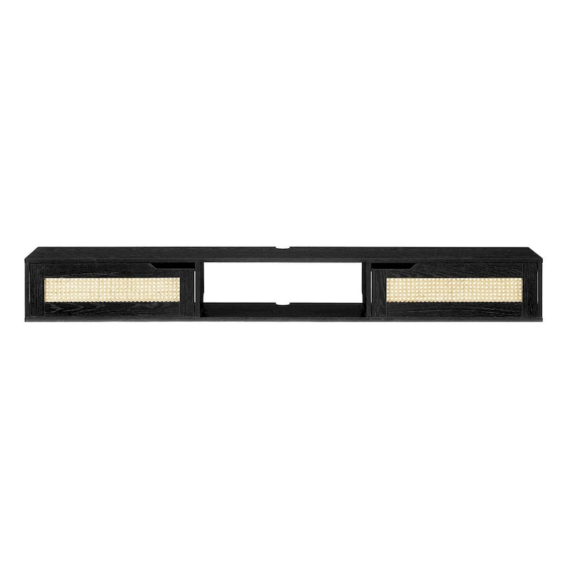 Create your very own relaxation station with this easy, breezy entertainment setup. This floating media console can sit stylishly under your wall-mounted TV, and it offers plenty of space for all your media and other entertainment essentials. A single open cubby and two cabinets behind closed doors offer the perfect perch for streaming devices, gaming systems, and dcor. While cord management ports and finger-pull door pulls lend this piece a sleek functionality, its faux rattan double doors are the stylish star of the show.