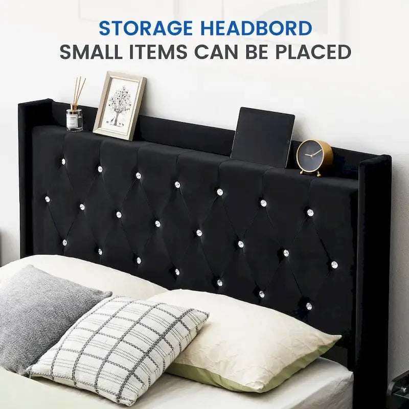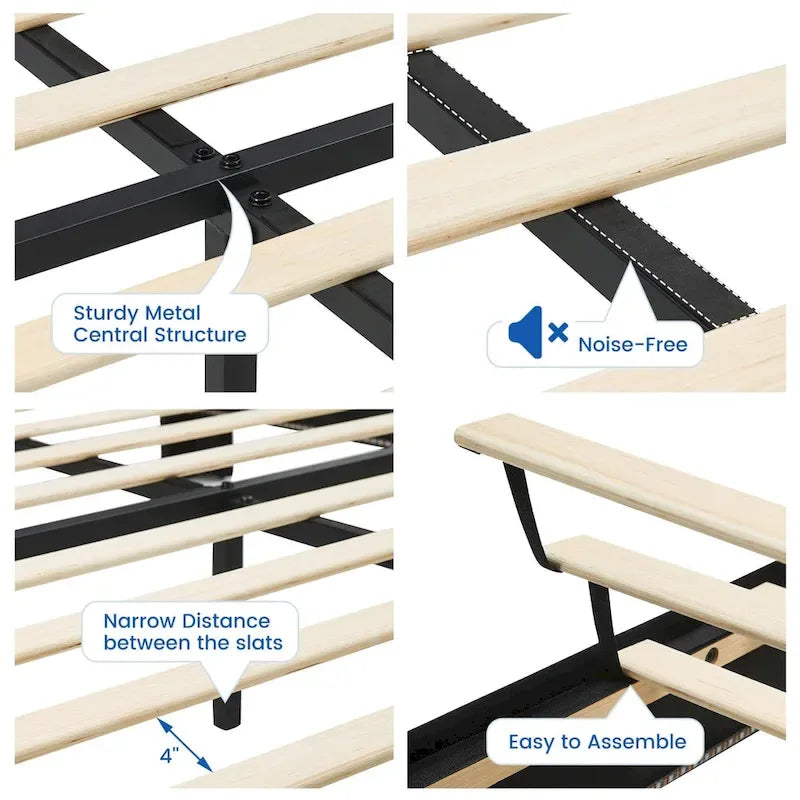 - Practical Storage Headboard: The headboard provides convenient storage space for your phone, alarm clock, photo albums, and other commonly used small items, making it very practical and convenient. Sturdy and Noise-free Bed Frame: We use metal legs and closely spaced wooden slats to ensure the stability of the bed frame. Soundproof cotton is placed between the wooden slats and metal bars, reducing friction and effectively lowering the noise level, providing a more comfortable sleeping environment.