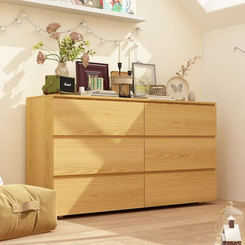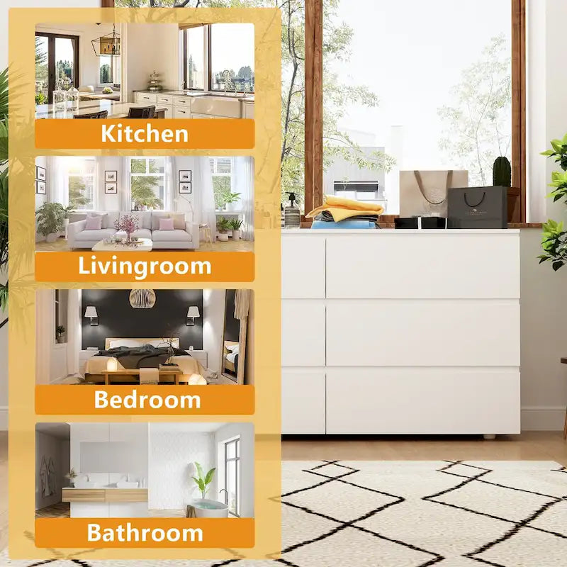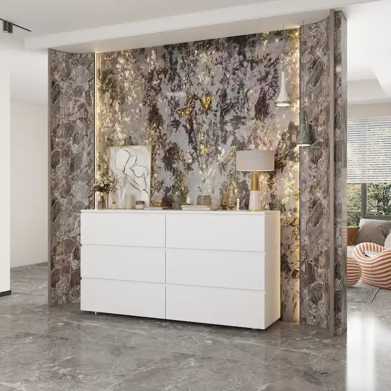 Add a touch of classic style to your bedroom with the Premium 59-inch 6 Drawers White Floor Double Dresser by Kerrogee. With its spacious 6 drawers and wide tabletop, this dresser offers ample space to store your clothing and daily essentials. Made with durable and distortion-resistant MDF board with exterior triamine veneer, this dresser is built to last. Its scratch-resistant and easy-to-clean surface ensures it stays looking great for years to come. This multi-functional dresser is perfect for any room in the house, from the bedroom to the kids' room.