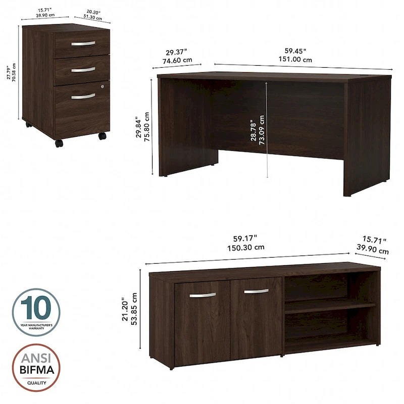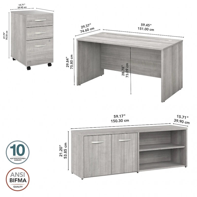 - Bundle includes: 60W x 30D Office Desk, 3 Drawer Mobile File Cabinet, Low Storage Cabinet with Doors and Shelves