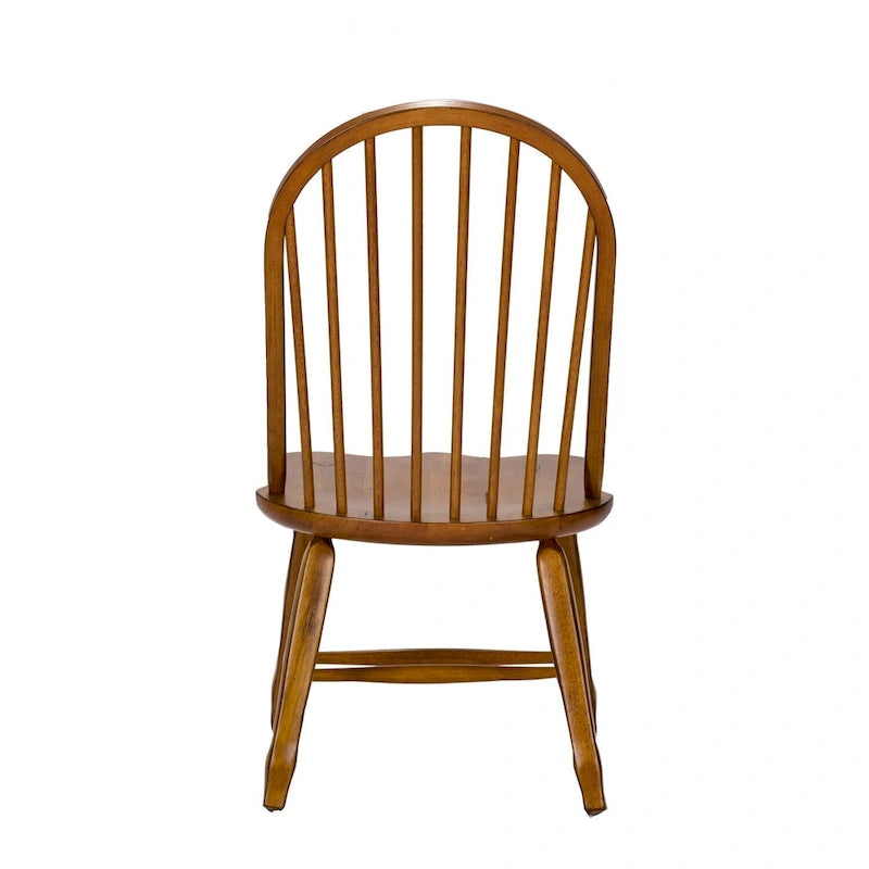 Design possibilities are endless with the Treasures five-piece set. Crafted of rubberwood solids and ash veneers, this set features a rustic oak finish and includes a rectangular leg table and four bow back side chairs. The leg table has a planked top and features two 18 removable leaves to accommodate guests or a larger family. The chairs have saddle shaped seats for added comfort and an H shaped stretcher for extra support as well as nylon chair glides to protect your flooring. Treasures offers simple shaker styled dining in a subtle finish which evokes the feel of a treasured antique.