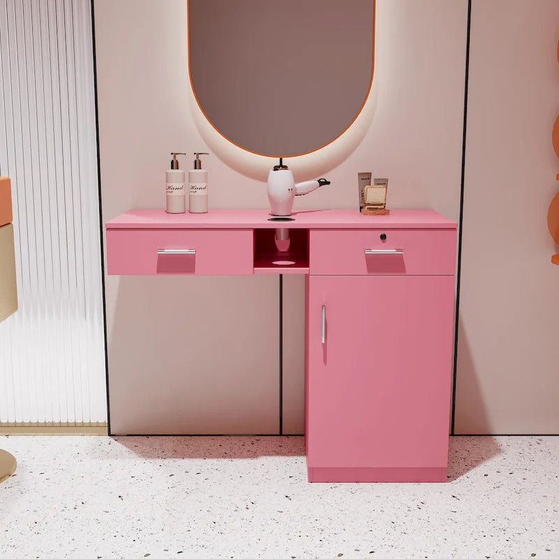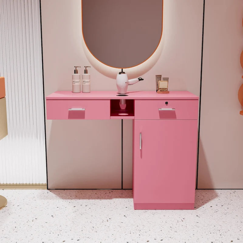 Introducing our Wall Mount Hair Stylist Salon Station, a sleek storage solution for beauty professionals. Crafted from high-quality particleboard, it ensures durability and easy maintenance. With ample storage space including enclosed drawers and a large cabinet, it keeps your salon essentials organized. The lockable drawer adds security, while the table top with round holes accommodates hair dryers and tools. Its versatile design fits seamlessly into any space, whether in a bedroom, bathroom, barbershop, or salon.